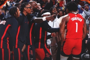 赛后火箭官方赢球海报封面人物给到了阿门·汤普森,为其末节最后时刻补篮打进后的庆祝画面。