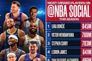 体育资讯12月24日讯 今天,NBA官方晒出了本赛季NBA社交媒体平台上观看次数最多的10位球员,其中9位将在圣诞节当天亮相,详情如下: