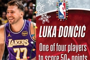 官推写道:历史上只有四位球员在圣诞大战砍下50+,东契奇就是其中之一。