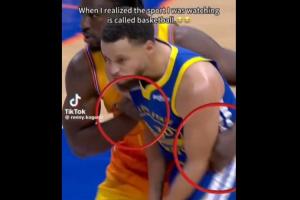 GIF-库里被连拉带拽 跑到底角还被一屁股拱倒 裁判没有任何表示