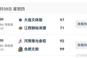 2025-2026赛季WCBA常规赛今日仅两场B组比赛。B 组头两名合肥女篮和大连女篮均获得胜利。