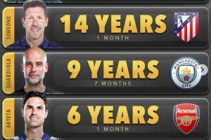 体育资讯1月25日讯 数据网站Score90盘点了五大联赛球队现任主帅最长执教时长榜单,具体如下: