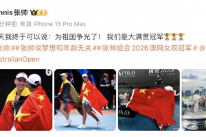 体育资讯1月31日讯 夺得澳网女双冠军后,张帅更新社媒,表示自己“为祖国争光了”。