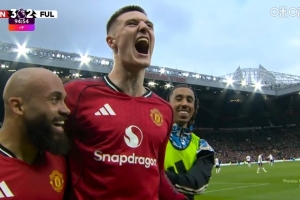 曼联主场3-2绝杀富勒姆,比赛第94分钟,替补上场的舍什科送出绝杀。