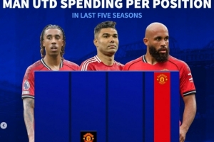 体育资讯12月16日讯 德转盘点了近5个赛季曼联在各个位置引援花费情况,其中锋线引援花费明显最多,具体如下: