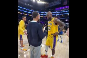 GIF-库里詹姆斯赛后交谈 海斯试图介入 但……